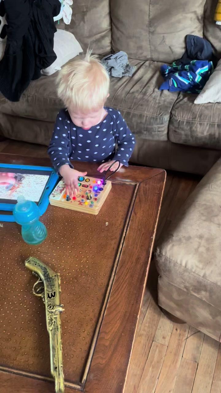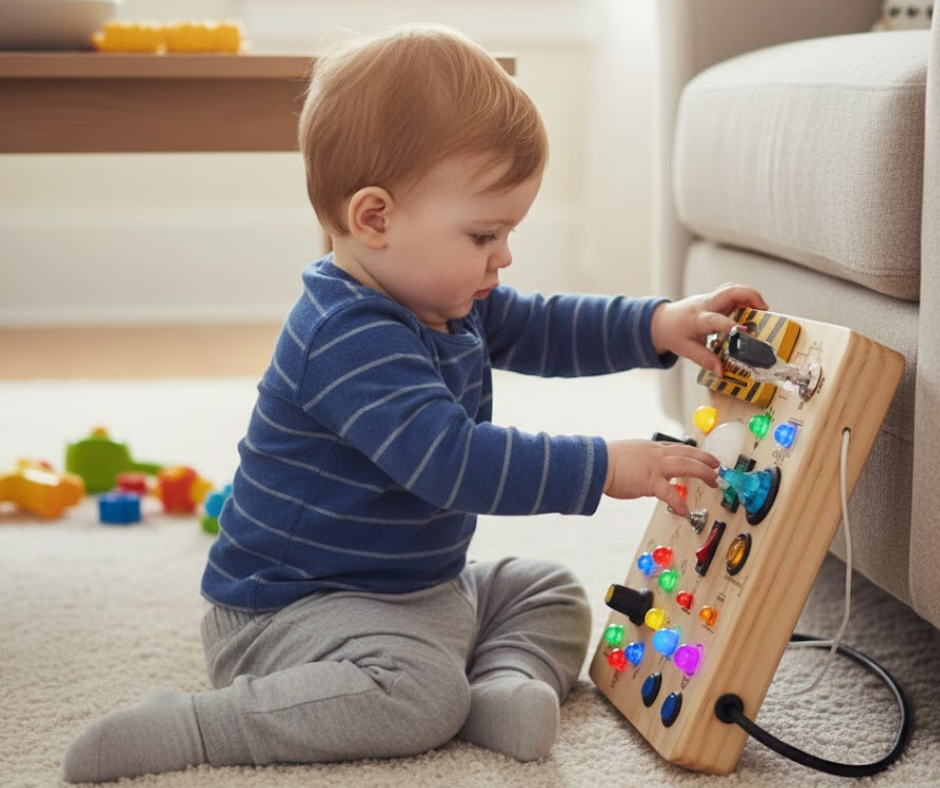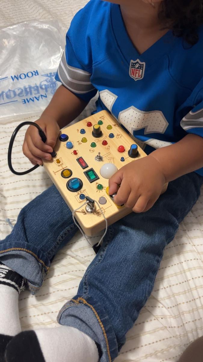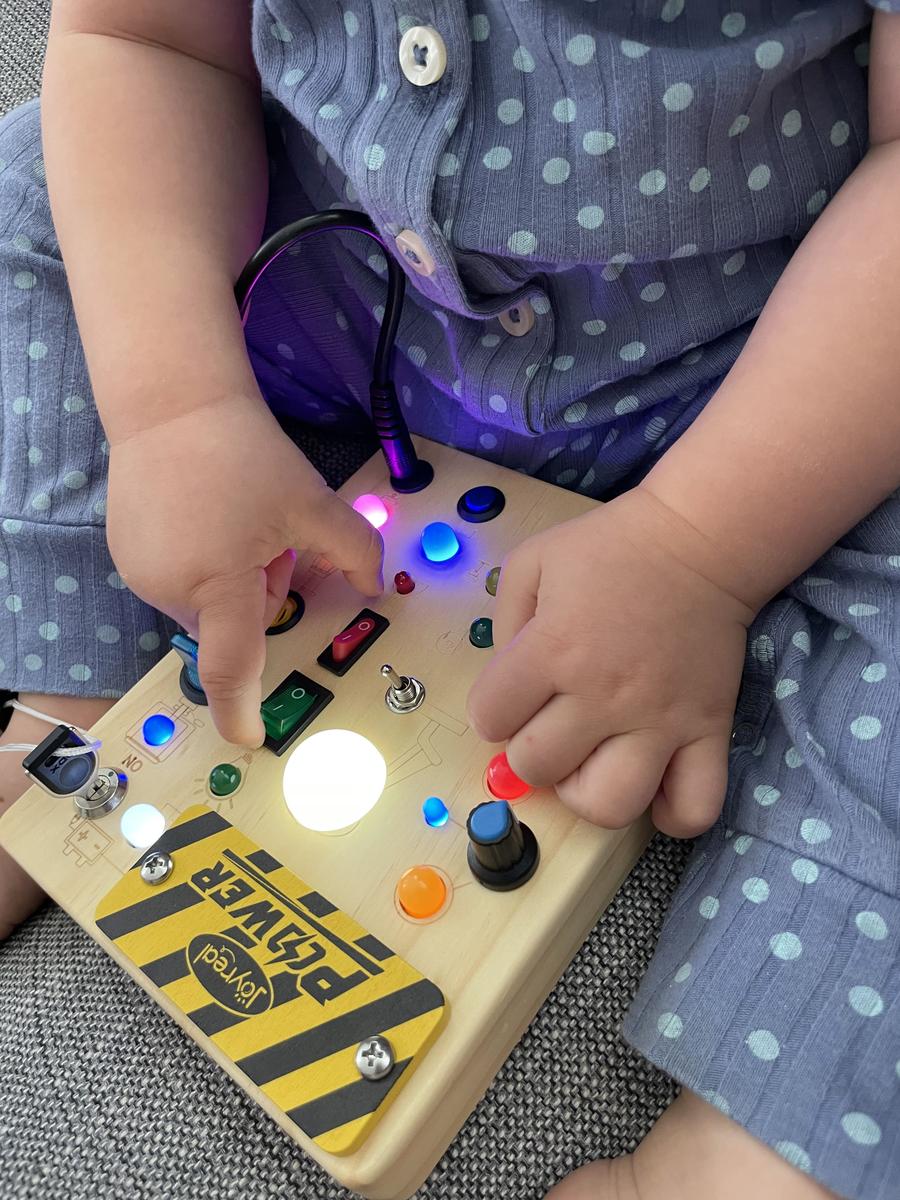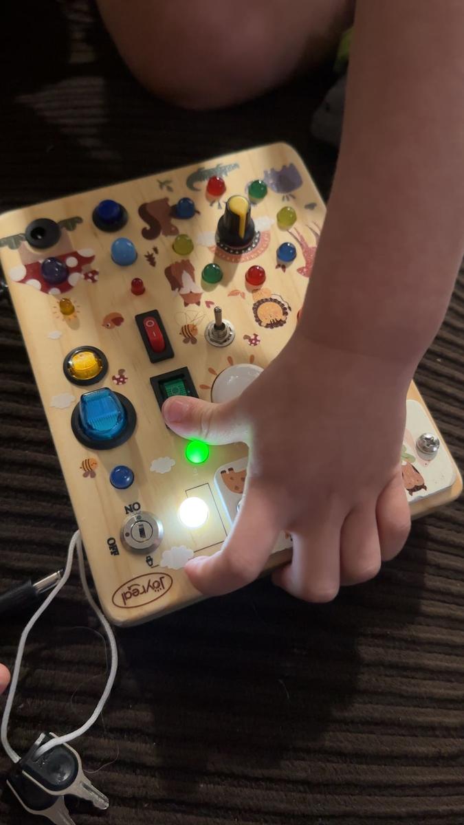 The board gives toddlers a “forbidden” control panel they’re finally allowed to touch. This keeps them engaged without screens, noise, or constant supervision.
